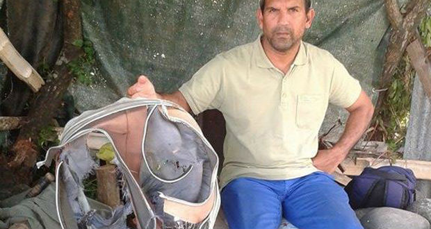 Un des préposés à l'entretien du littoral tenant une valise déchiquetée découverte ce jeudi matin au même endroit que le morceau d'avion.