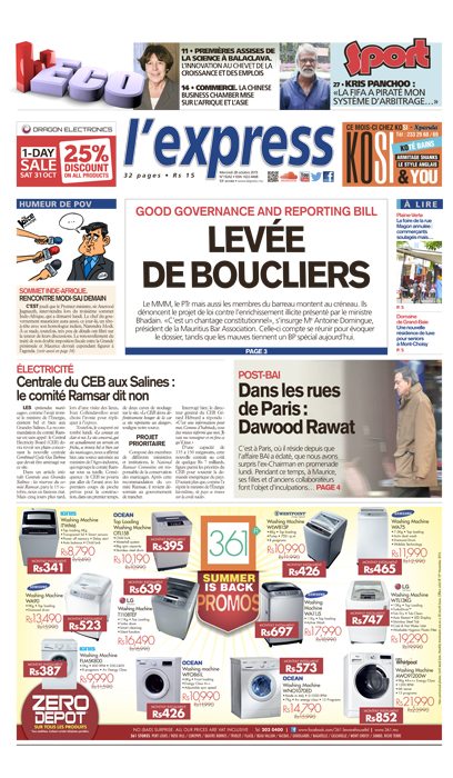 En Une de l’express: le projet de loi loi contre l’enrichissement illicite présenté par le ministre Bhadain. Le MMM, le PTr mais aussi les membres du barreau montent au créneau. Autres titres: Dawood Rawat surpris dans les rues de Paris, le comité Ramsar dit non concernant la centrale du CEB aux Salines et rencontre Modi-SAJ demain.
