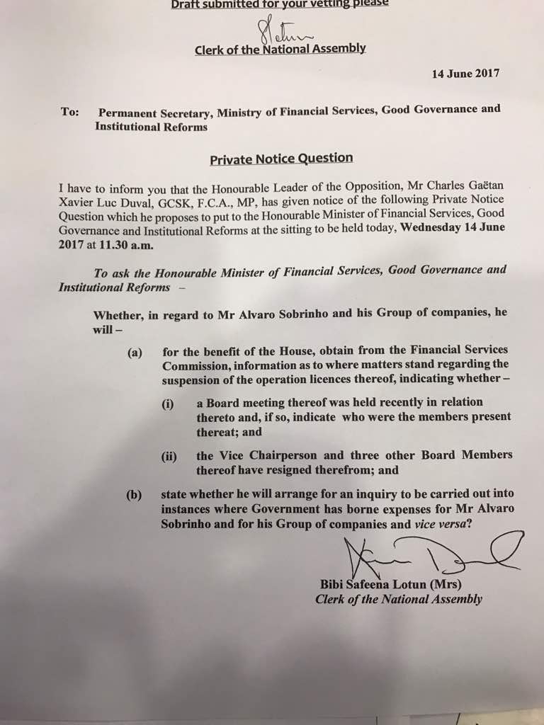 C'est l'affaire Sobrinho qui sera au centre des discussions au Parlement ce mercredi 14 juin. La question du leader de l'opposition Xavier Luc Duval est adressée au ministre de la Bonne gouvernance et des Services financiers, Sudhir Sesungkhur.