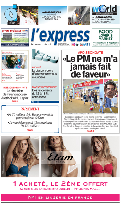 En une de l’express : «Le PM ne m’a jamais fait de faveur», dit Bassoodeo Seetaram. Autres titres : la diaspora devra déclarer ses revenus mauriciens ou encore la directrice de Pelangi accuse Aret Kokin Nu Laplaz