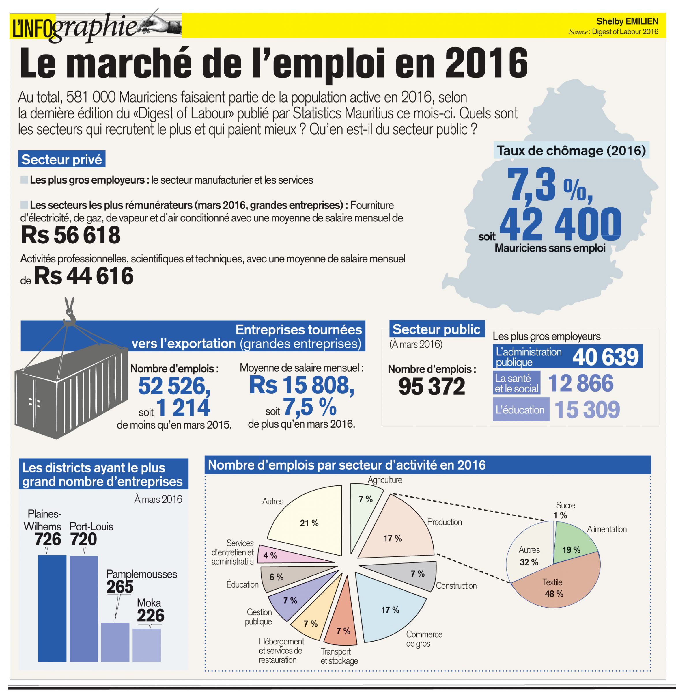 581 000 salariés en 2016. C’est ce que révèle le «Digest of Labour», publié récemment par Statistics Mauritius. 42 400 chômeurs sont également recensés. Quels sont les secteurs qui recrutent le plus et qui paient mieux ? Qu’en est-il du secteur public ?