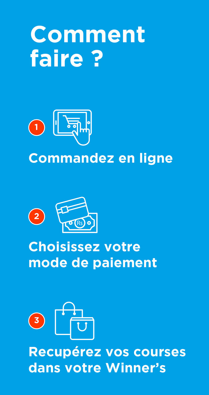 Pour commander, il suffit d’aller sur le site www.winners.mu. Le procédé est très simple : vous choisissez vos produits comme en magasin, passez votre commande avant de la récupérer le jour et l’heure qui vous conviennent. De chez vous ou depuis votre bureau, à vous de choisir le meilleur moment de la journée pour effectuer vos courses en ligne.