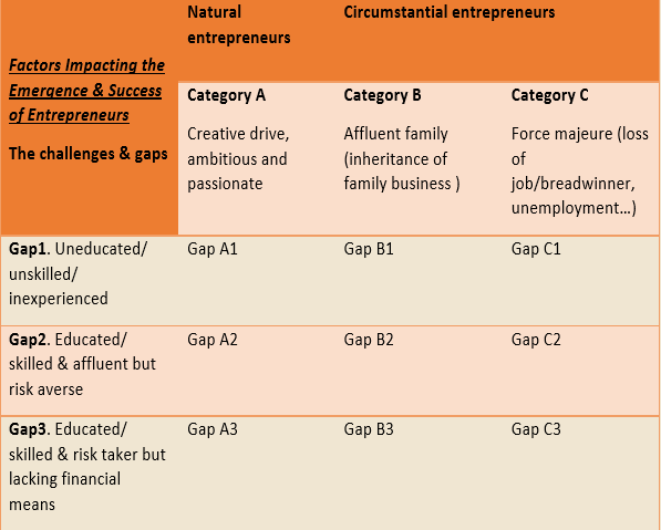 Faded dreams, suppressed passion and suffocated ideas… Look around you, and try to find those who have succeeded in becoming an entrepreneur. There are very few who succeed in that endeavour. The adjacent table shows that there are 3 main categories of emerging entrepreneurs. For entrepreneurs, it can be a question of personal choice to live one’s passion (Category A), or a matter of duty or family responsibility (Category B) or even a course of action of last recourse due to a force majeure (Category C)! Now in each category there are 3 main types of challenges or gaps that the potential entrepreneurs need to bridge: Gap1 – they may be uneducated or unskilled; Gap2 – they may be educated, skilled and even affluent but are risk averse; and finally, Gap 3 – they may be educated/skilled/ risk taker but lack the financial means!