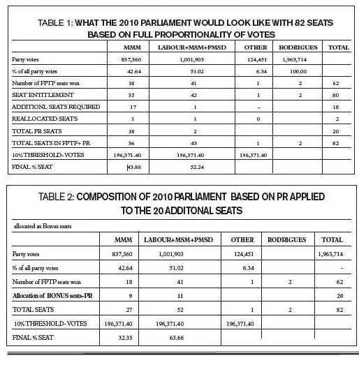 The additional seats allocated to the party are then chosen from the party list or from among its unreturned candidates where dual or double candidacy is allowed. Appointments are made by the appropriate independent institutions and not by party leaders as it is proposed for Mauritius - partly at least. Table 1 below depicts the probable composition of our Parliament in 2010 based on full proportionality of votes.